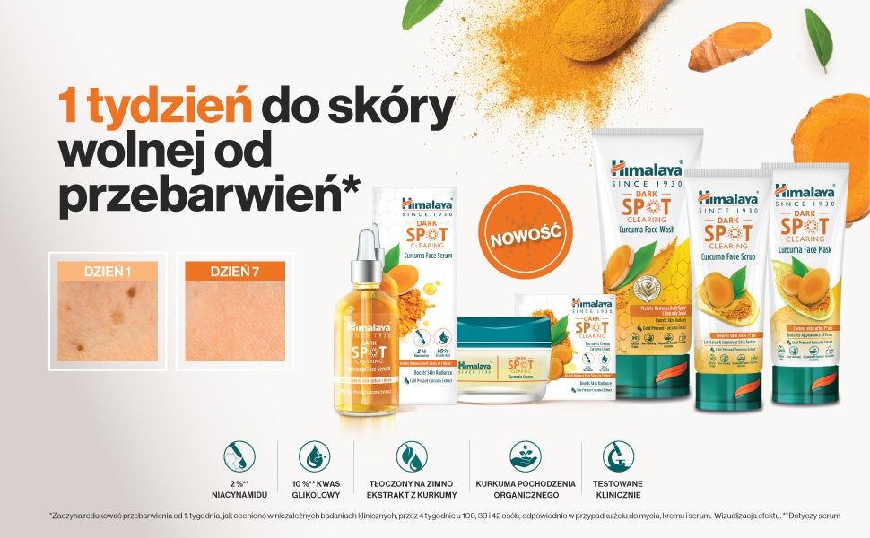 Maseczka do twarzy Himalaya Dark Spot Clearing Curcuma to unikalna formuła wykorzystująca moc tłoczonego na zimno ekstraktu z Kurkumy oraz Lukrecji mające silne silne działanie antyoksydacyjne. Pomagają oczyścić głębokie zanieczyszczenia skóry, rewitalizują matową skórę i pomagają redukować przebarwienia, pozostawiając skórę wyraźnie czystą, świeżą i promienną.