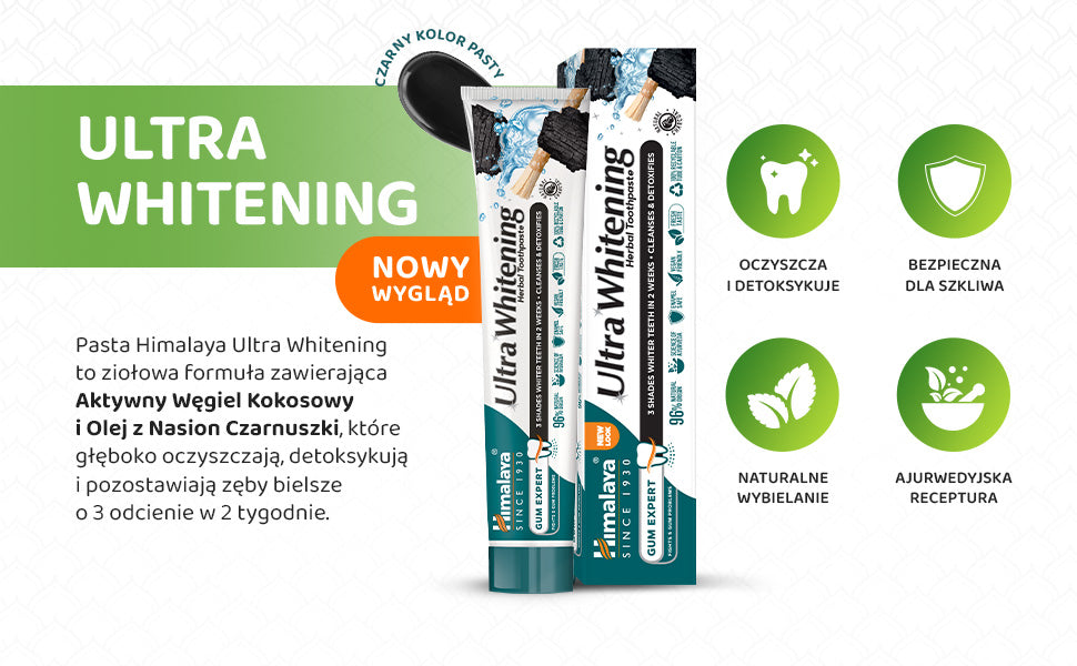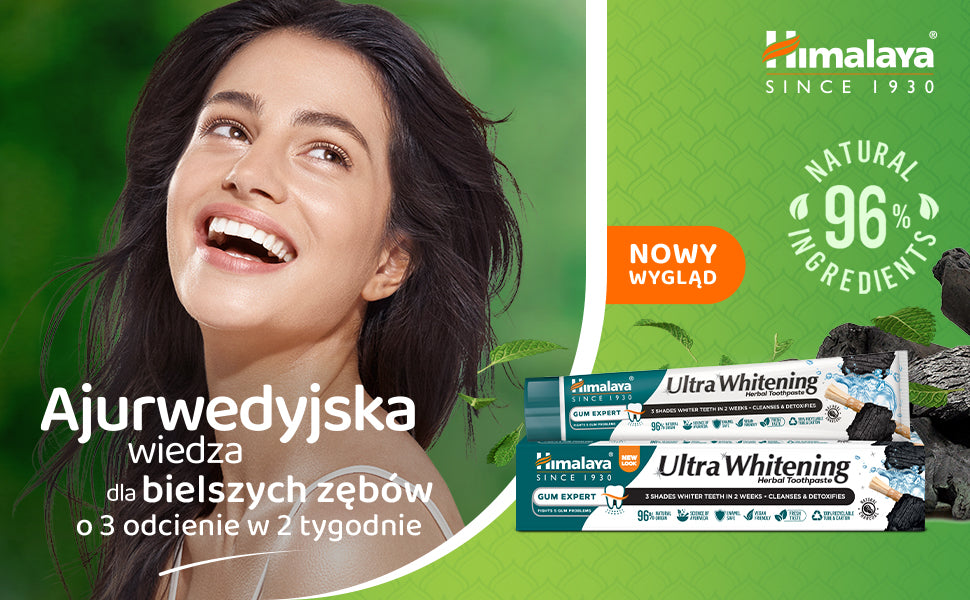 Pasta Himalaya Ultra Whitening to ziołowa formuła zawierająca Aktywny Węgiel Kokosowy i Olej z Nasion Czarnuszki, które głęboko oczyszczają, detoksykują i pozostawiają zęby bielsze o 3 odcienie w 2 tygodnie.