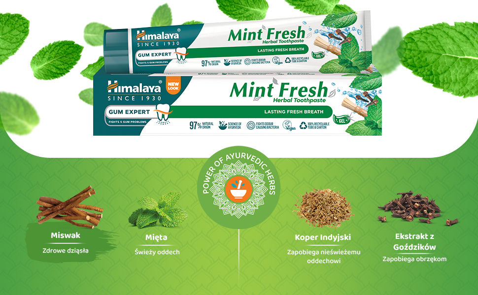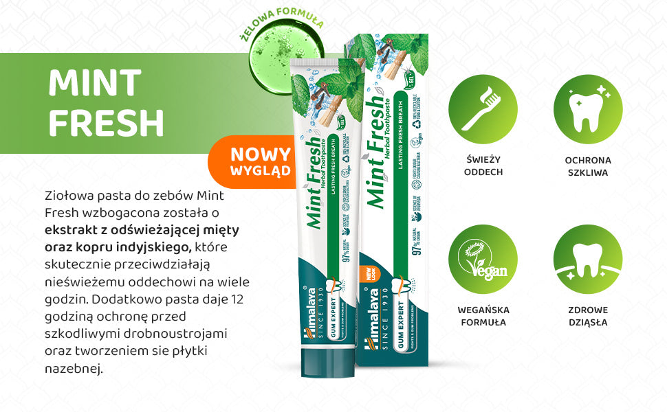 Ziołowa pasta do zebów Mint Fresh wzbogacona została o ekstrakt z odświeżającej mięty oraz kopru indyjskiego, które skutecznie przeciwdziałają nieświeżemu oddechowi na wiele godzin. Dodatkowo pasta daje 12 godziną ochronę przed szkodliwymi drobnoustrojami oraz tworzeniem sie płytki nazebnej.