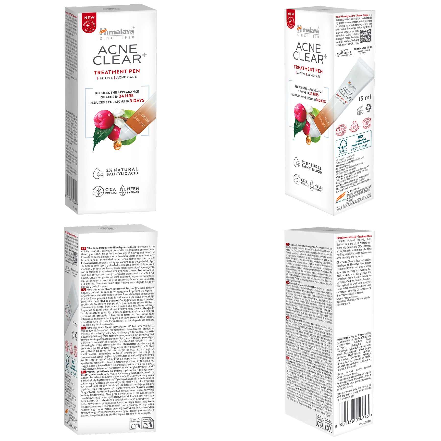 Szybko zwalczaj wypryski dzięki Himalaya Acne Clear+ Treatment Pen, klinicznie przetestowanemu korektorowi, który w ciągu 24 godzin redukuje widoczne pryszcze. Ten korektor zawiera 2% naturalnego kwasu salicylowego, CICA (Centella Asiatica) i ekstrakt z miodli indyjskiej, dzięki czemu eliminuje 99,9% bakterii trądzikowych. Precyzyjny aplikator pozwala na łatwą i precyzyjną aplikację w dowolnym momencie. Lekka, nietłusta formuła zawierająca 98% składników pochodzenia naturalnego jest idealna do codziennej, ukierunkowanej pielęgnacji. Klinicznie udowodniona skuteczność w zwalczaniu 5 objawów trądziku — nadmiernego wydzielania sebum, pryszczy, zaczerwienień, zatkanych porów i śladów — dla widocznie czystszej skóry w krótszym czasie.