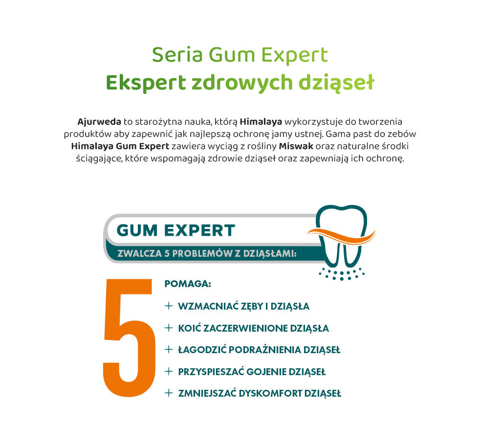 Linia past do zębów Himalaya Herbals Gum Expert zawiera Miswak i naturalne substancje ściągające, które zapewniają dziąsłom zdrowie i ochronę.