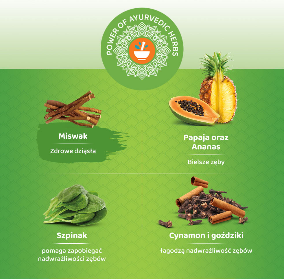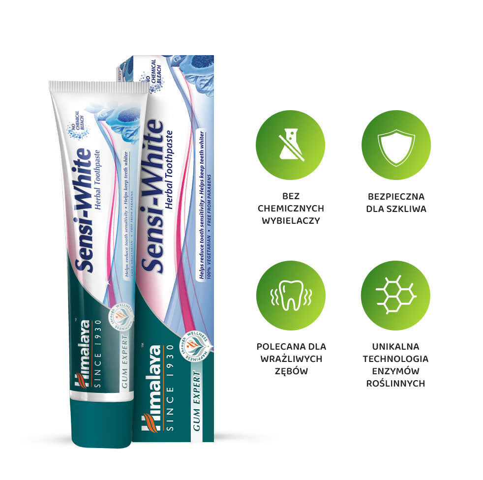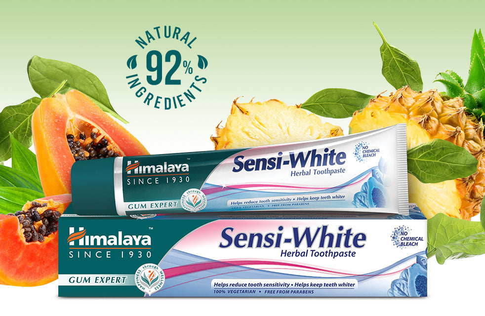 Pasta Sensi-White jest oparta na Technologii Enzymów Roślinnych z Papai i Ananasa, które pomagają naturalnie utrzymać biel zębów i usunąć powierzchowne przebarwienia zębów. Dodatkowo pasta Sensi-White jest wzbogacona ekstraktami ze Szpinaku, które pomagają zmniejszyć wrażliwość zębów, podczas gdy naturalnie zawarty w Suryakshara działa jak środek znieczulający zęby.